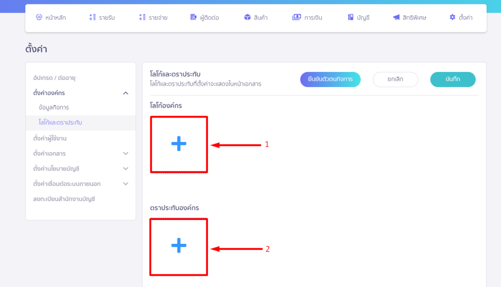 จากนั้นให้กดที่เครื่องหมายบวกในช่อง “โลโก้องค์กร” หรือ “ตราประทับองค์กร” แล้วกดเลือกไฟล์รูปภาพ เพื่ออัพโหลดไฟล์