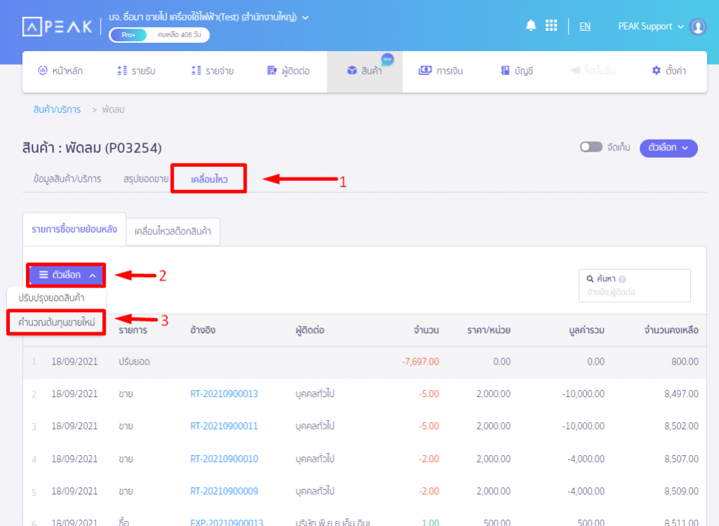 ในโปรแกรม PEAK จึงมีปุ่มสำคัญ ชื่อว่า ปุ่ม “คำนวณต้นทุนขายใหม่” เพื่อคำนวณต้นทุนขายใหม่ให้ถูกต้อง