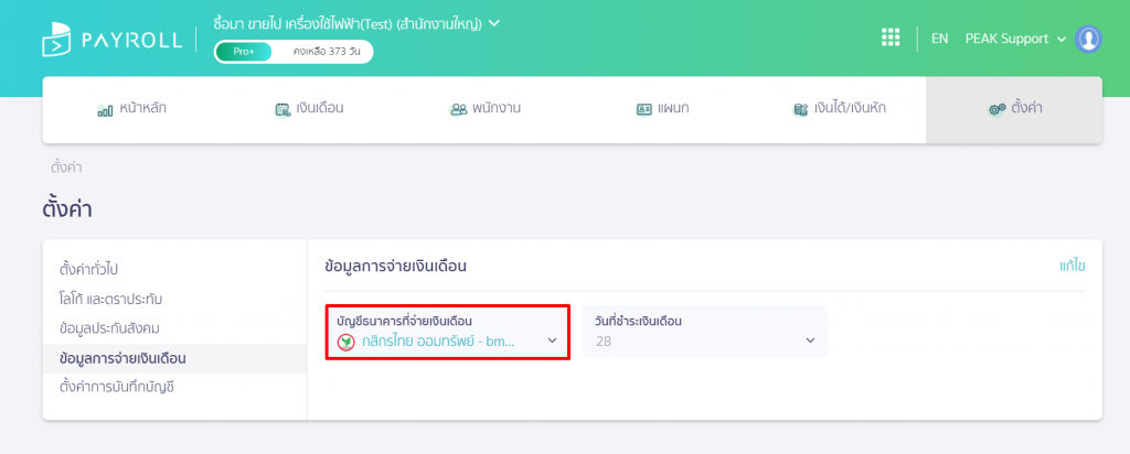โดยเข้าที่เมนูตั้งค่า >> ข้อมูลการจ่ายเเงิน >> เลือกเป็นการจ่ายเงินเป็นธนาคารกสิกรไทย >> และกำหนดวันที่ชำระเงินเดือน