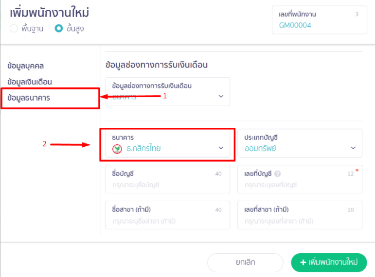 • กรณีเพิ่มพนักงานใหม่ = เข้าที่เมนูพนักงาน >> กดเพิ่มพนักงาน >> เลือกขั้นสูง >> ช่องข้อมูลธนาคาร>> ตรงธนาคารเลือกเป็นธนาคารกสิกรไทยและใส่ข้อมูลที่ต้องการให้ครบ