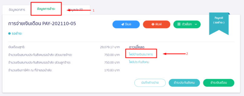 • เข้าที่เมนู + ทำจ่ายเงินเดือน >> เมื่อทำจ่ายเงินเดือนเรียบร้อยแล้ว >> ให้กดที่หัวข้อมูลการชำระ >> ไฟล์จ่ายเงินธนาคาร
