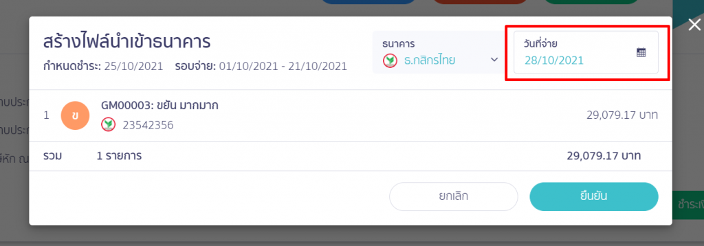 เมื่อคลิกที่ไฟล์จ่ายเงินธนาคารแล้ว ให้ทำการระบุวันที่จ่าย และกดยืนยัน